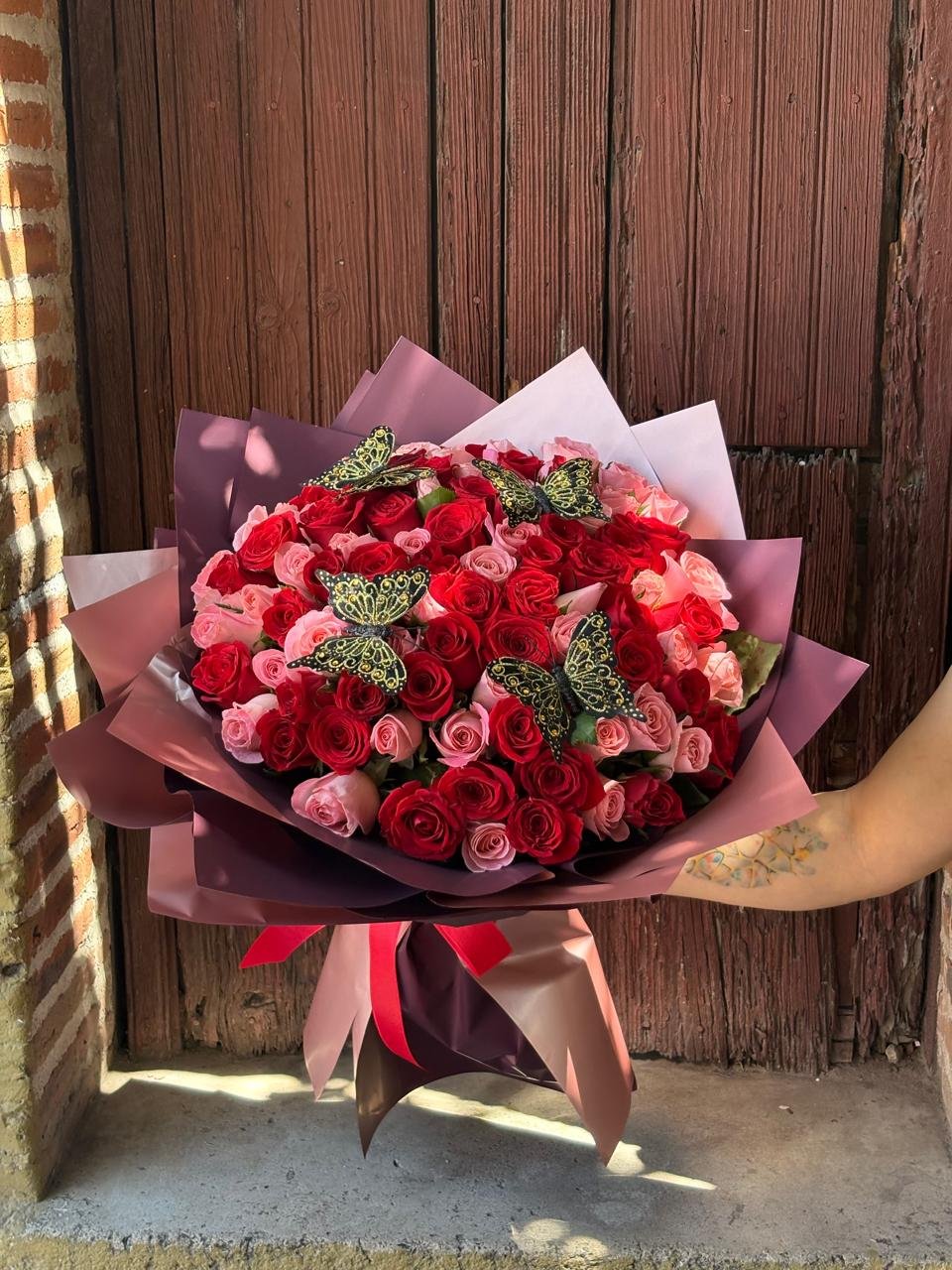 Ramo 100 rosas Amor en rosa con 4 mariposas